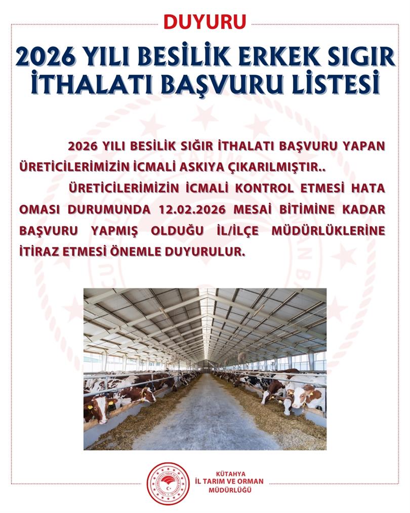 2026 YILI BESİLİK SIĞIR İTHALATI BAŞVURU YAPAN ÜRETİCİLERİMİZİN İCMALİ ASKIYA ÇIKARILMIŞTIR..
